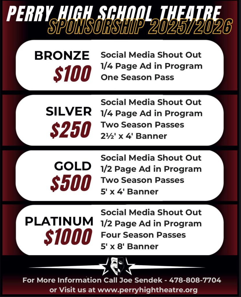 We are excited to announce several opportunities to continue the tradition of excellence in the Perry High School Theatre Department. Sponsorship and donations help fund production expenses, materials, and student needs for our shows.
